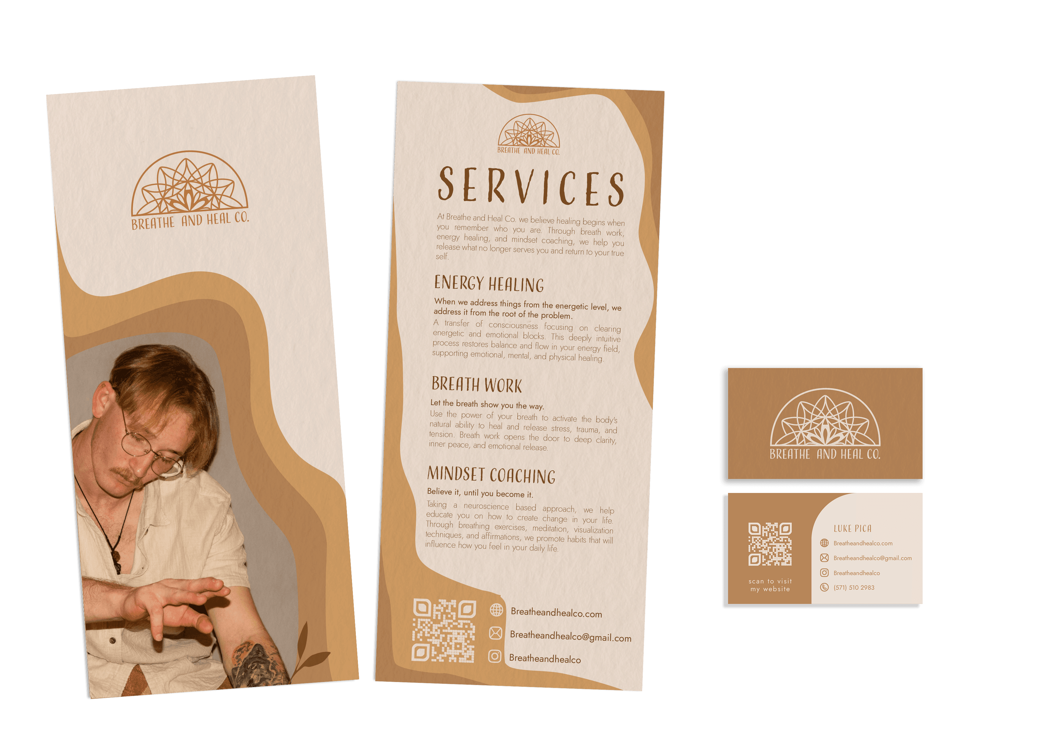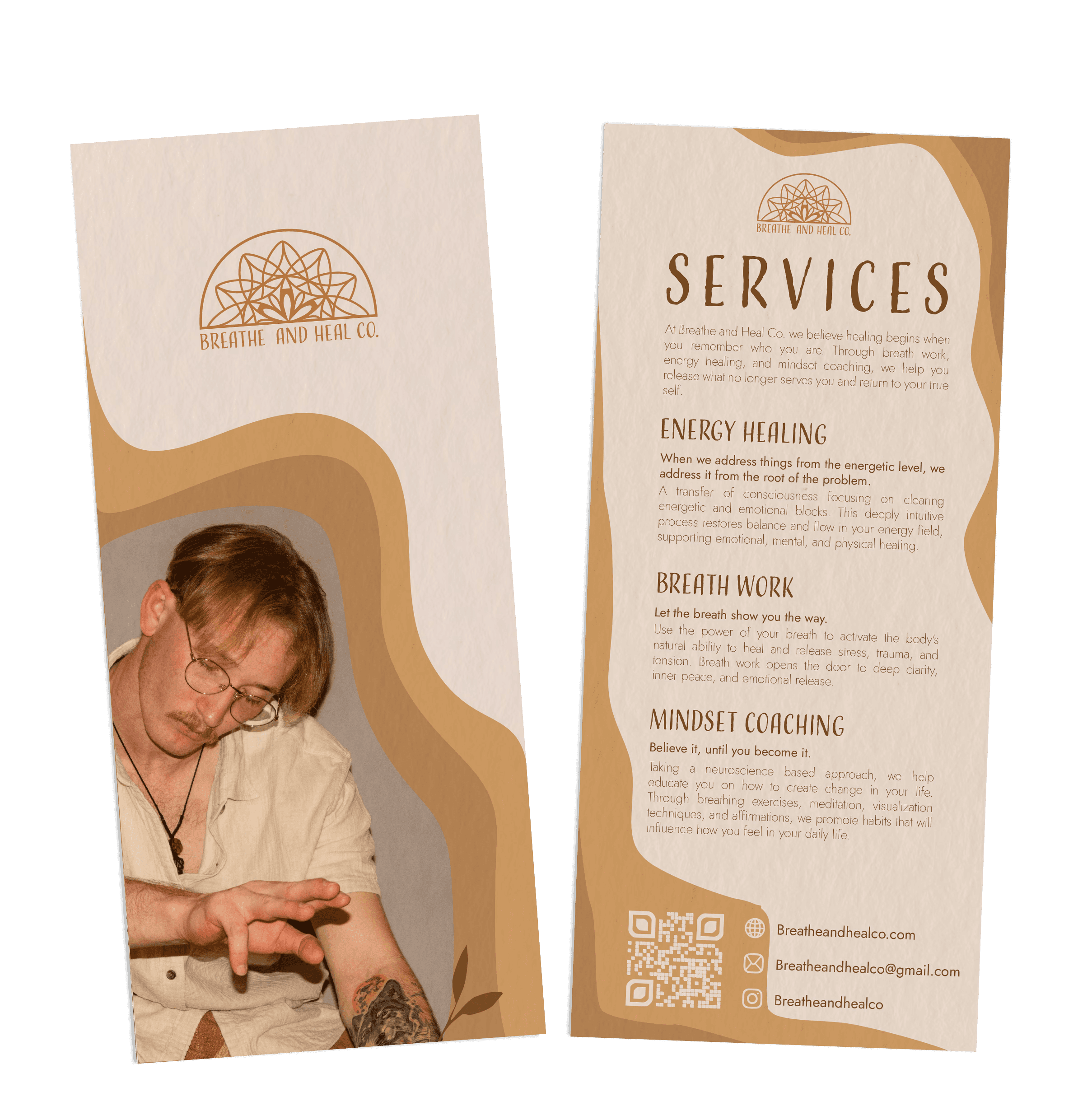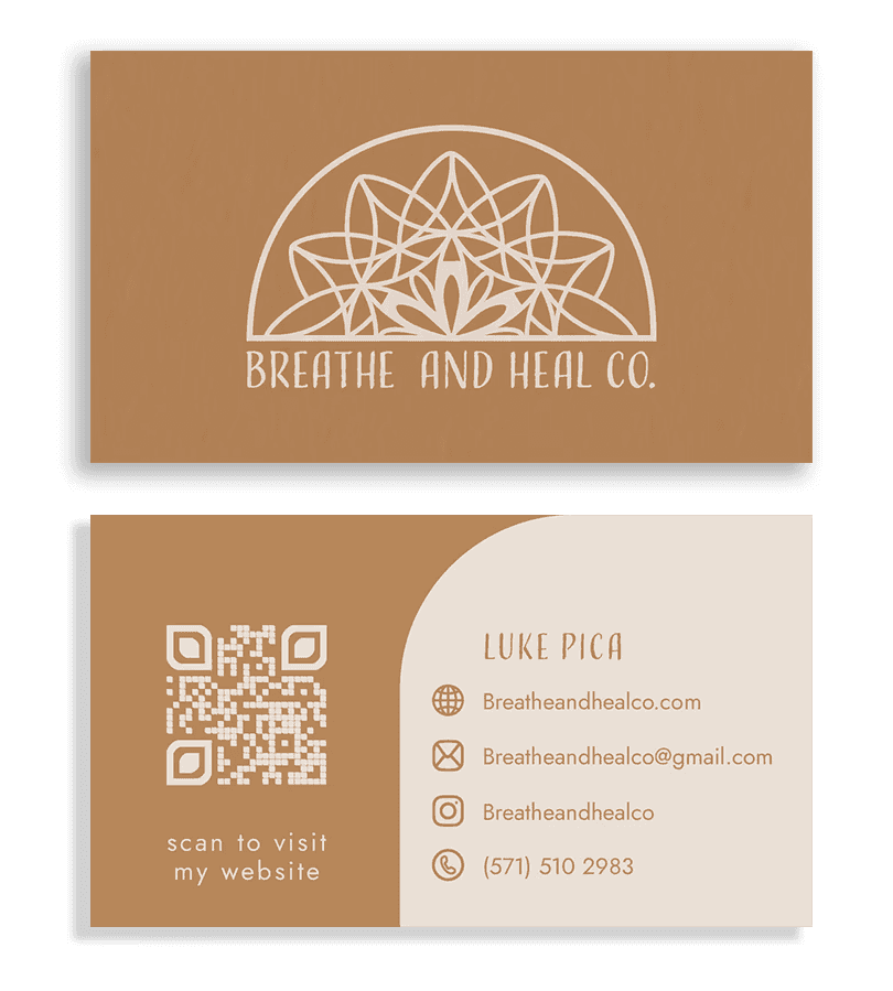 I designed a rack card and a set of business cards for Breathe and Heal Co. that match their warm, calming vibe. The rack card lays out their three main services in a clear and inviting way, with earthy colors and soft patterns that feel grounded and intentional. The business cards are simple but thoughtful, with clean text and a look that feels both professional and personal. Everything ties back to the brand’s mission of helping people reconnect with themselves.